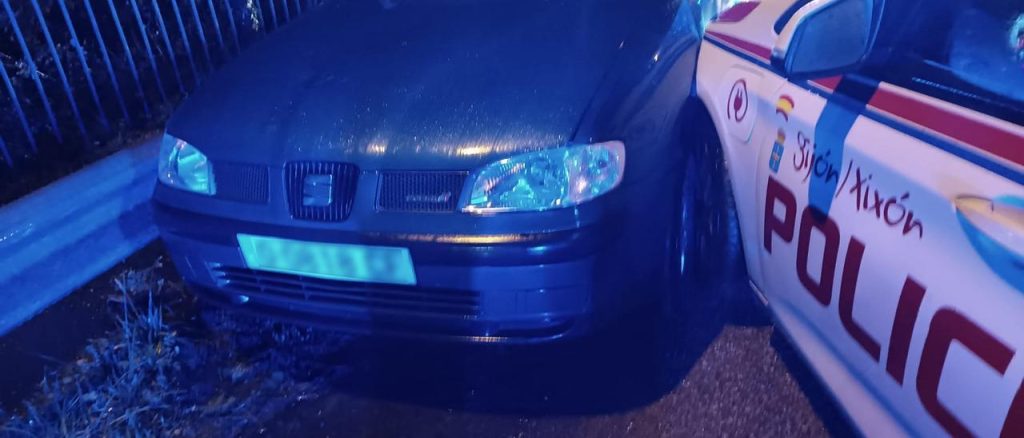 Se trataba de un Seat Córdoba de color verde. Los agentes lo localizaron en la calle Ramón y Cajal y fueron a darle el alto. Los atracadores no se dejaron coger y trataron de escapar a toda velocidad con las luces apagadas y sin cinturón de seguridad. Escaparon hacia la carretera de Ceares e hicieron un trompo en la glorieta de acceso al cementerio del Suco. Después se fueron por Hermanos Felgueroso, Fuente del Real, Pérez de Ayala y la avenida Constitución. Por esta vía circularon en dirección contraria mientras eran perseguidos por varias patrullas. La persecución terminó cuando uno de los coches policiales se puso en paralelo al de los atracadores y chocaron. Tampoco entonces se dejaron coger los dos detenidos. Se escaparon por las ventanillas y trataron de irse a la carrera.